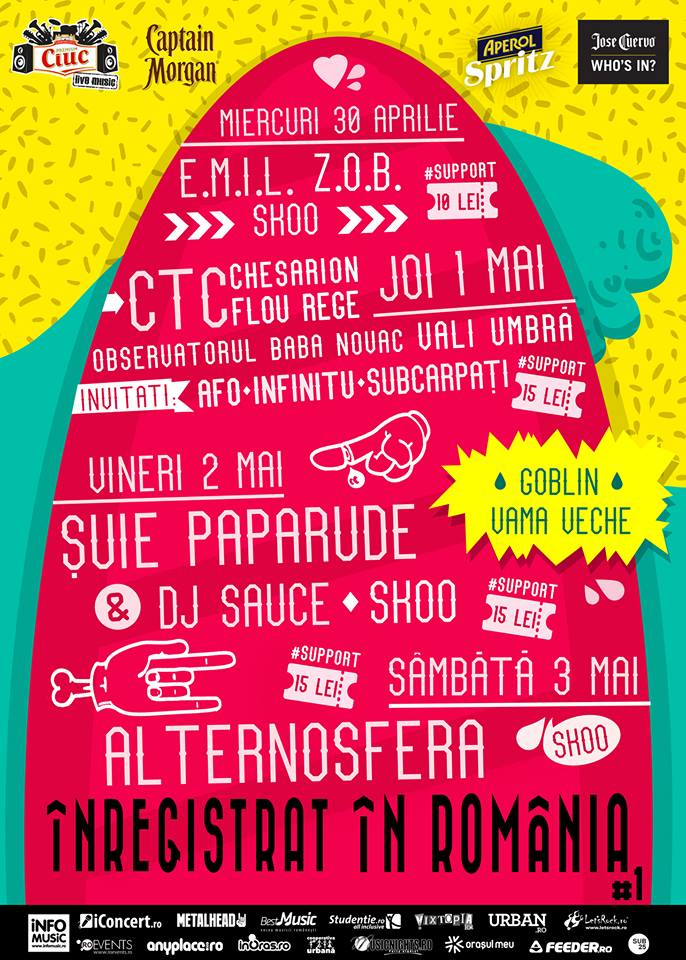 Nume „grele” ale scenei locale sunt prezente la aceast prim eveniment „Inregistrat in Romania”: Alternosfera, Suie Paparude, C.T.C., Subcarpati, E.M.I.L., ZOB, Vali Umbra, AFO, Infinitu’ aka Sfantu’8, Flou Rege, Chesarion.