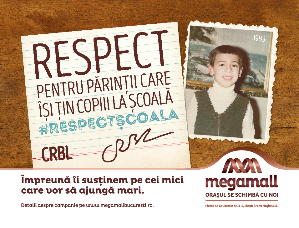 Mega Mall demareaza campania ”Respect Scoala” a carei demers este acela de a readuce in discutie tema respectului pentru scoala si educatie si importanta acestora in dezvoltarea celor mici. Mega Mall va ajuta mii de copii fara posibilitati din intreaga tara prin donarea a mii de rechizite necesare inceputului de an scolar.